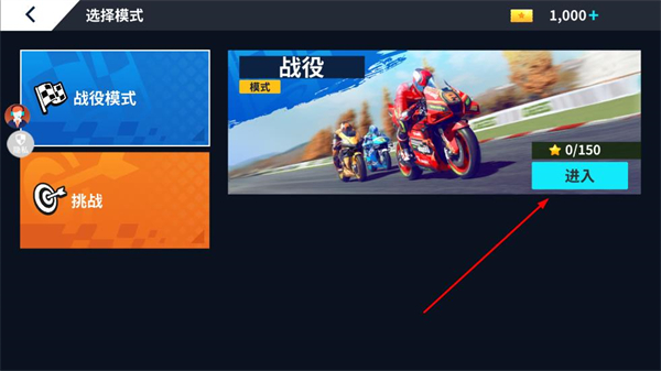 1、進入選擇模式頁面,選擇戰役模式,查看該模式的進度顯示,點擊進入按鈕,進入對應的模式界面,準備選擇地圖開啟競速比賽。