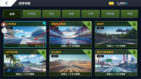 2、選擇地圖頁面,選擇業余難度下的訓練賽道,該賽道無需前置條件即可進入,點擊對應的賽道選項,準備進入該賽道的競速比賽。