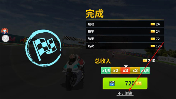 4、完成賽程后進入結算界面,查看本次比賽的各項數據及總收入,選擇對應選項領取獎勵,也可跳過額外獎勵,準備開啟下一輪的競速挑戰。