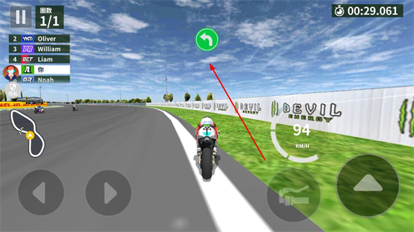 3、進入賽道后操控摩托行駛,觀察界面的轉向提示調整方向,點擊加速按鈕保持車速,留意當前名次及其他選手位置,穩定推進賽程。