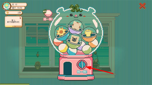 3、進入扭蛋界面,點擊轉一轉按鈕啟動扭蛋機,參與扭蛋玩法,獲取隨機的綠植相關道具。