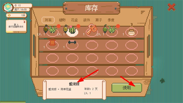 1、打開庫存界面,選擇蛇龍球植物,點擊使用按鈕,將其布置到窗臺的花盆里,豐富窗臺的綠植種類。