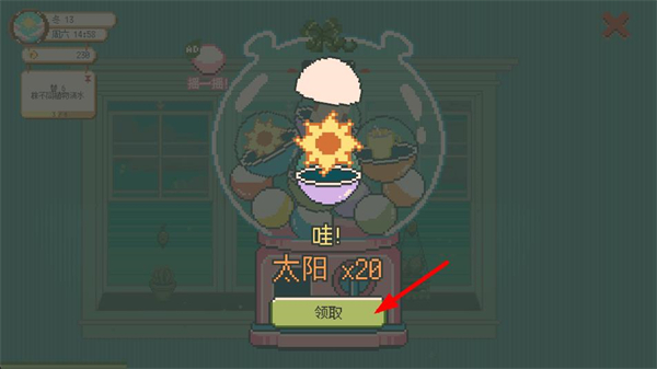 4、扭蛋結束后出現獎勵界面,點擊領取按鈕,獲取本次扭蛋得到的太陽道具,積累綠植養護的資源。