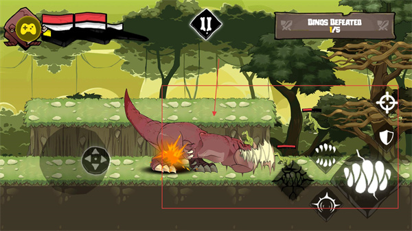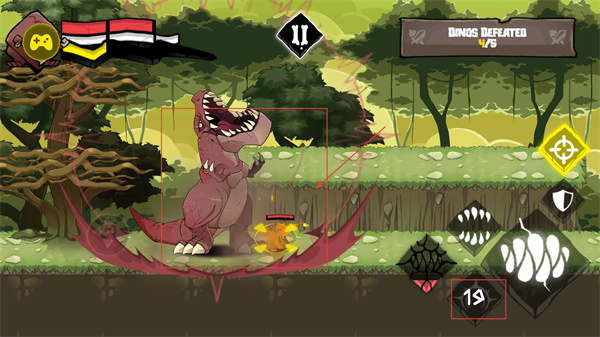 1、戰斗中可釋放攻擊技能,對敵方恐龍造成傷害,同時界面會顯示已擊敗恐龍數量,持續攻擊可推進關卡目標。