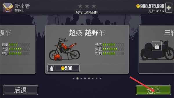 2、在載具選擇界面,消耗500金幣可解鎖超級越野車,該載具在速度、大量、控制屬性上表現更優,提升逃生效率。