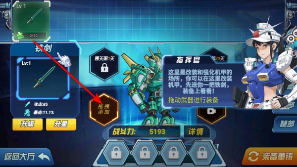 1、找到對應的武器,拖動它到指定位置進行裝備,裝備后能提升機甲的攻擊屬性,同時可以通過升級升星進一步強化武器效果。