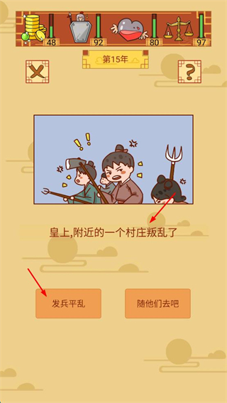 2、政事處理界面內遇到村莊叛亂,果斷選發兵平亂,部署高戰力部隊,爭取戰斗勝利。