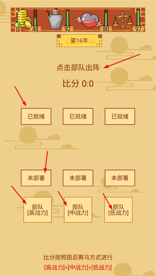 3、作戰時合理分配部隊,按高、中、低戰力匹配,利用田忌賽馬思路贏取勝利。