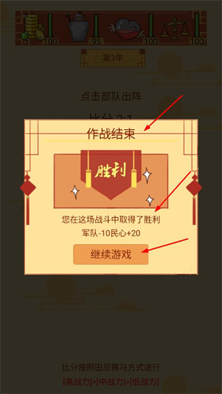 4、勝利后領取獎勵,繼續推進年份,解鎖更多模塊,拓展治國策略,提升體驗。