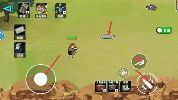 1、進入游戲主界面,可使用地圖、背包等功能,通過移動按鈕操控角色移動,還能使用武器、醫療道具,右上角自瞄功能可輔助瞄準,助力戰斗。
