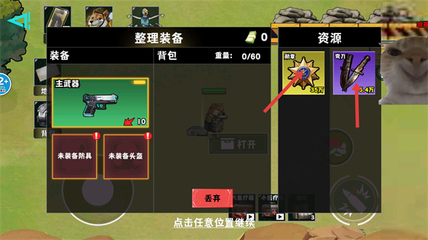3、打開物資箱后進入整理裝備界面,可查看獲得的裝備如主武器、資源如勛章、彎刀,還能處理未裝備的道具,管理背包重量避免超限。