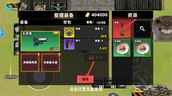 4、在整理裝備界面,可選擇丟棄不需要的物品,同時右側資源欄會顯示新增的物資如香檳、玫瑰碟,合理規劃物資可提升資源利用效率。