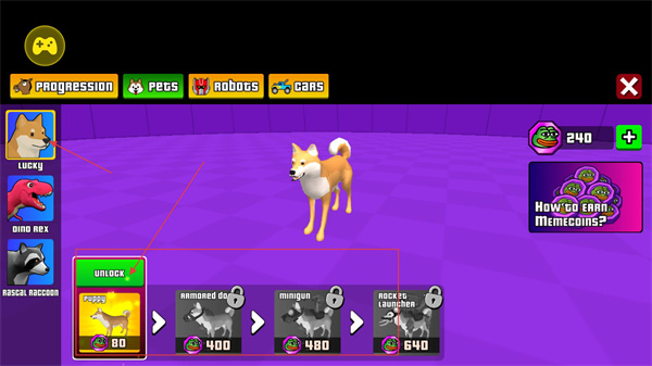 2、寵物界面的首項是柴犬類寵物,消耗80枚特殊貨幣即可解鎖基礎形態,后續還可解鎖裝甲、武器等進階形態,形態進階會增強寵物。