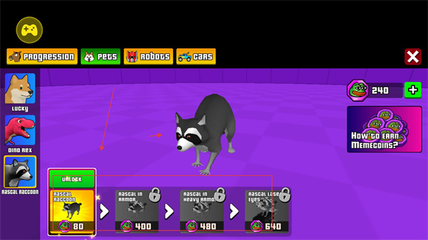 4、浣熊類寵物的解鎖規則與前兩類一致,基礎形態消耗80枚特殊貨幣,進階形態需更高數量的貨幣,寵物解鎖后可跟隨角色。