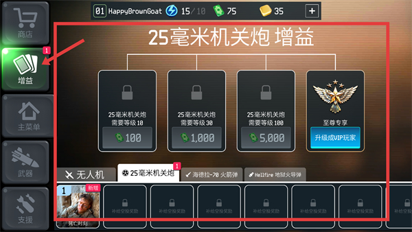 3、增益界面可查看武器對應的增益選項,如25毫米機關炮的增益需滿足等級和資源條件,提升增益能強化武器屬性,需先積累資源、提升等級來解鎖增益。
