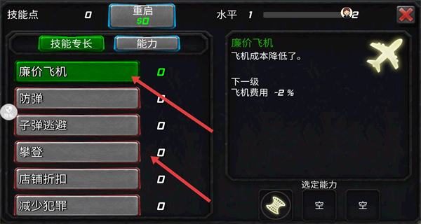 3、進入技能界面后可分配技能點解鎖廉價飛機防彈等能力,不同技能對應不同增益,選擇技能后點擊選定能力即可生效。