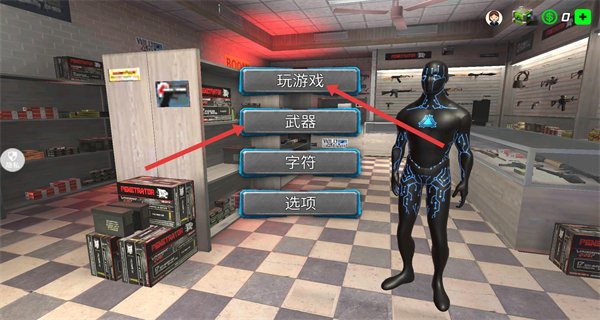 1、進入游戲主界面后可通過玩游戲進入主場景,武器字符點擊進入商城分別對應裝備更換角色外觀定制資源購買功能,選項可調整游戲設置。