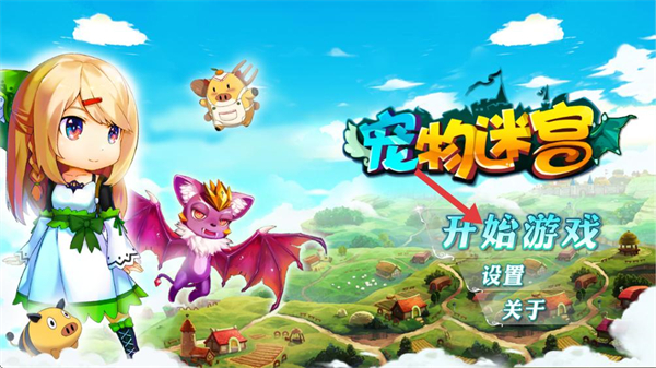 1、進入游戲啟動頁,點擊開始游戲即可進入游戲,也可通過設置、關于調整游戲配置或了解游戲信息,開啟寵物迷宮的探索之旅。