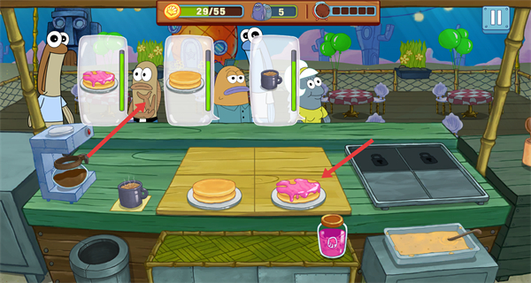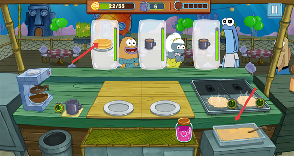 1、快節奏烹飪系統考驗即時反應與順序管理,顧客同時要求煎餅、果醬與咖啡,玩家需在進度條滿格前收取食物。燒焦料理會導致顧客流失與收入減少。