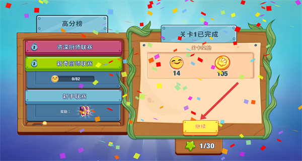4、當關卡進度達成要求后,界面會顯示通關提示與對應的獎勵內容,點擊繼續按鈕,即可結束當前關卡,進入后續的游戲環節。