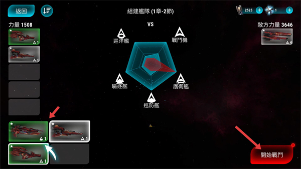 3、進入組建整備界面,選擇合適的艦船裝備,將其配置到對應的位置,完成艦船的裝備調整后,點擊開始戦鬥按鈕。