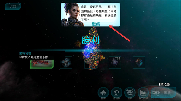2、查看勝利相關的提示內容,點擊繼續按鈕,進入后續的艦船配置環節,為下一場戰斗做準備。