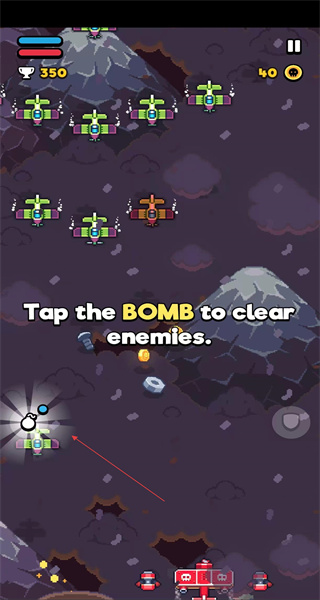1、打開游戲后,進入關卡,看到界面提示及敵方單位,點擊炸彈道具,清除當前區域的敵人,同步獲取對應的游戲獎勵。