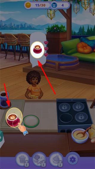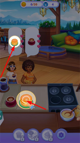 3、繼續處理剩余客人的需求,將制作好的咖啡拖到客人的需求框,完成訂單后進度進一步提升,可解鎖更多內容。