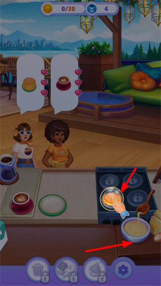 1、先看到餐廳場景,界面上方顯示進度和人數,點擊灶臺旁的食材,可開始制作對應的餐食,滿足客人需求。