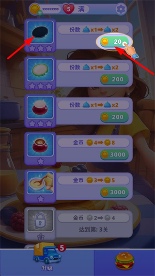 4、進入升級界面,選擇對應餐食項目點擊升級,消耗金幣可提升份數或金幣收益,升級后能更高效地完成后續訂單。