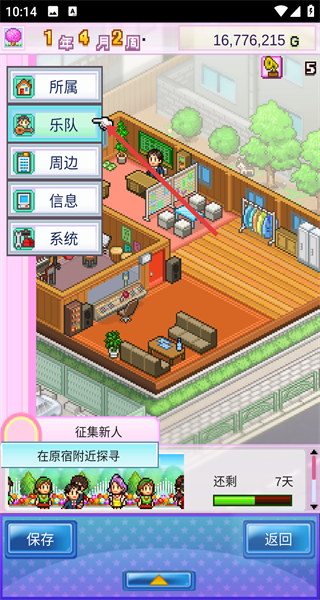 百萬樂曲物語無限金幣無限創意點是一款讓玩家扮演音樂經紀公司董事長的經營養成游戲,簡約清爽的像素風格與舒緩愉悅的背景音樂構建輕松的視聽氛圍。核心玩法圍繞發掘新人、規劃課程培訓與安排出道活動展開,通過唱片制作、舉辦演唱會及參與綜藝節目等多種途徑積累藝人的人氣。