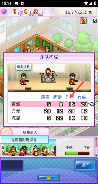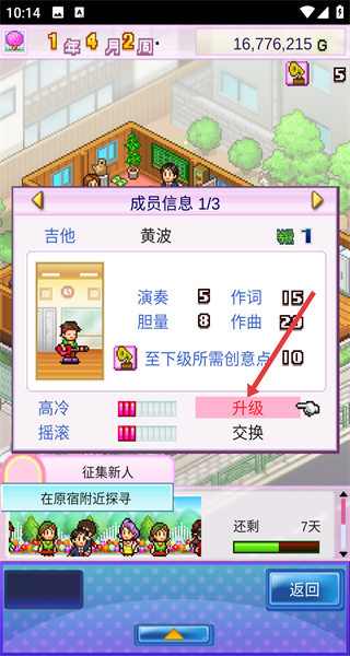4、在樂隊成員的信息界面中找到升級按鈕并點擊,消耗對應的創意點來提升該成員的等級,以此增強成員的各項能力屬性。