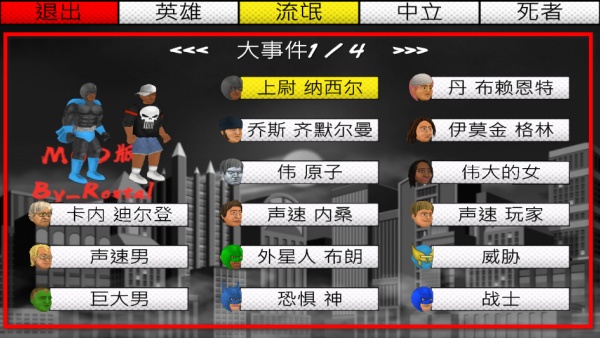 1、進入游戲后可看到角色選擇界面,不同分類下有多個角色可選,選定角色后即可開啟對應的大事件關卡。