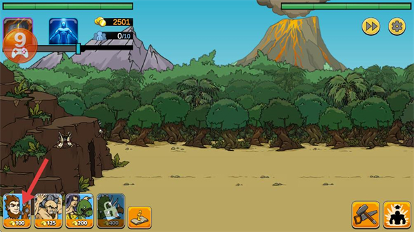 3、戰斗界面中玩家需消耗資源金幣召喚兵種,同時可升級科技解鎖更高時代的單位,目標是摧毀敵方基地。