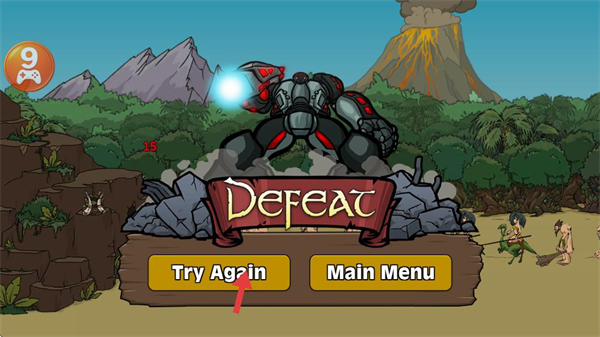 4、若關卡失敗會顯示Defeat界面,可選擇重新挑戰,游戲通過時代演進兵種搭配的策略性,考驗玩家的資源分配與攻防節奏把控能力。