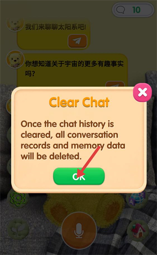 4、清理聊天記錄時會彈出提示框,說明清除后所有對話記錄與記憶數據將被刪除,點擊OK即可完成清理,保障用戶的聊天記錄管理權限。