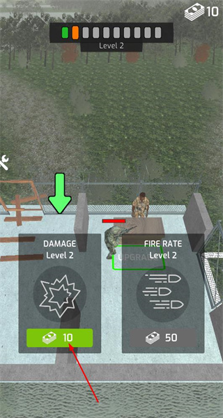 4、進入升級界面,看到傷害、射速等升級選項,選擇傷害升級項,消耗10資源提升角色能力。
