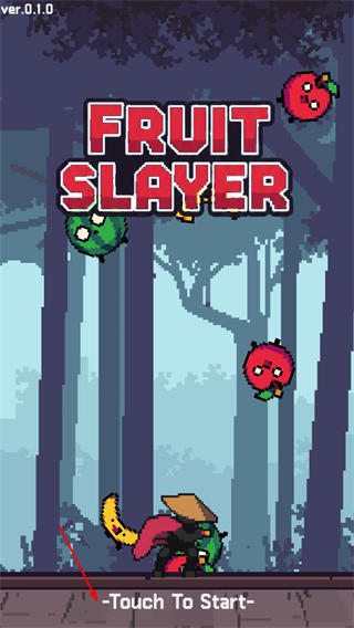 1、進入水果殺手游戲界面,點擊屏幕底部的Touch To Start的提示區域,啟動游戲,進入森林風格的水果切割挑戰場景。
