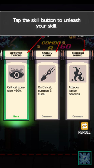 3、在技能選擇頁面,查看各技能效果,如OPENING THREAD增大暴擊區、KUNAI召喚苦無,按需選擇技能強化水果切割能力。