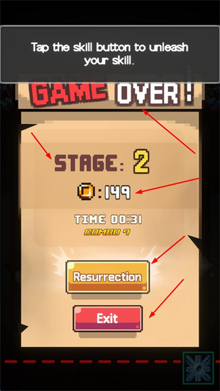 4、游戲結算界面,查看關卡STAGE2、金幣有149等數據,可選擇Resurrection復活繼續挑戰,或者點擊Exit退出重新開局。