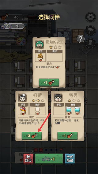 4、會出現選擇同伴的界面,不同同伴消耗資源不同且能力各異,比如勤勉的農工可額外產出資源。