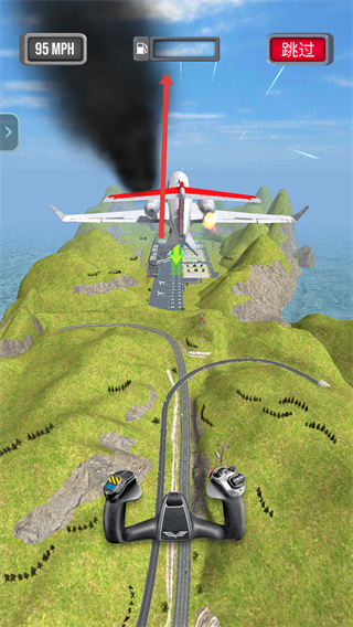 2、游戲中需操控飛機降落,界面顯示當前速度為95MPH,底部有操縱桿控件,需通過調整操縱桿控制飛機方向,同時注意跑道位置,按指引完成著陸操作。