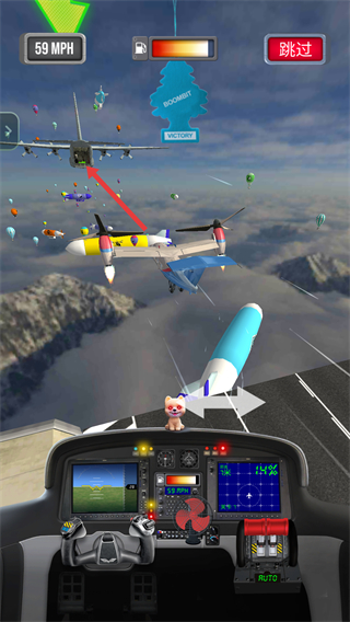 3、駕駛過程中會出現其他飛行器與氣球等元素,界面顯示速度59MPH,需避開障礙物,同時可通過操作獲取界面中的道具,助力完成飛行任務。