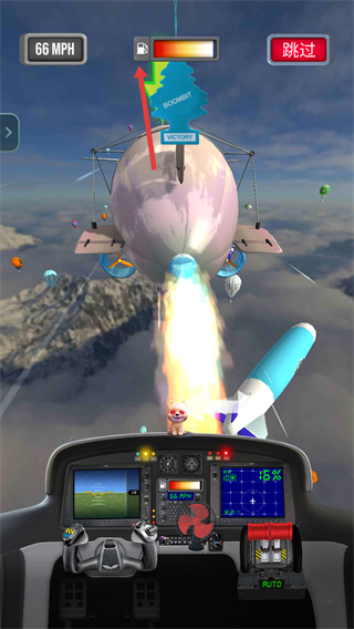 4、面對大型飛行物時,需調整飛機速度與方向,當前速度66MPH,通過操縱桿精準控制,可向目標發射道具,完成對應互動任務以推進游戲進程。