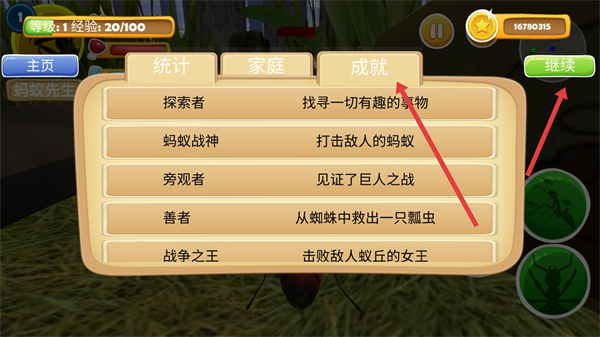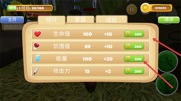 3、在統計界面可消耗金幣提升生命值饑餓值等屬性,每次升級優先提升當前緊缺屬性,增強螞蟻生存能力助力后續關卡挑戰。