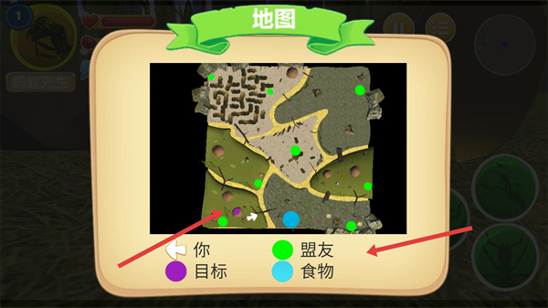 2、打開地圖界面可查看自身盟友食物及目標的位置標識,通過不同顏色區分各類元素依據地圖指引規劃移動路線,能快速定位資源或完成任務目標。
