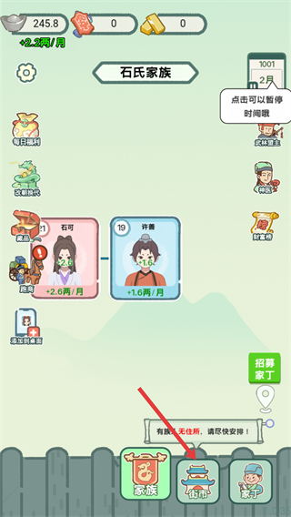 4、購置住宅后,點擊住宅界面中的添加按鈕,將無居所的族人安排至該住宅中,提升族人的狀態,推進家族的發展進程。