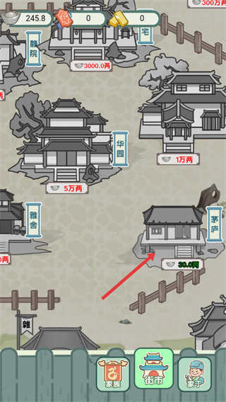 1、進入游戲界面后,找到下方的街市按鈕,點擊該按鈕進入街市場景,查看可購置的住宅選項,為族人準備居所。