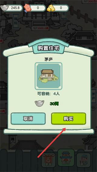 2、在街市場景中選擇合適的住宅建筑,點擊該建筑彈出購置界面,查看住宅的容納人數與所需資源,確認是否符合需求。