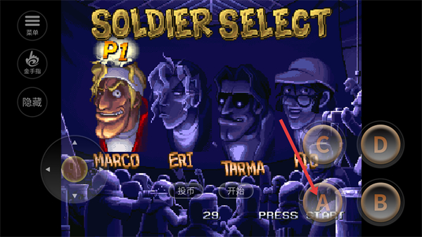 3、進入角色選擇界面,可選【MARCO】【ERI】等角色,不同角色無屬性差異,選擇目標角色后按對應按鍵確認,即可進入關卡開始戰斗,新手可任意選初始角色。
